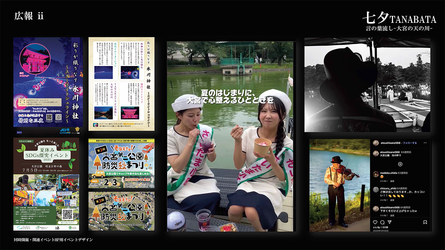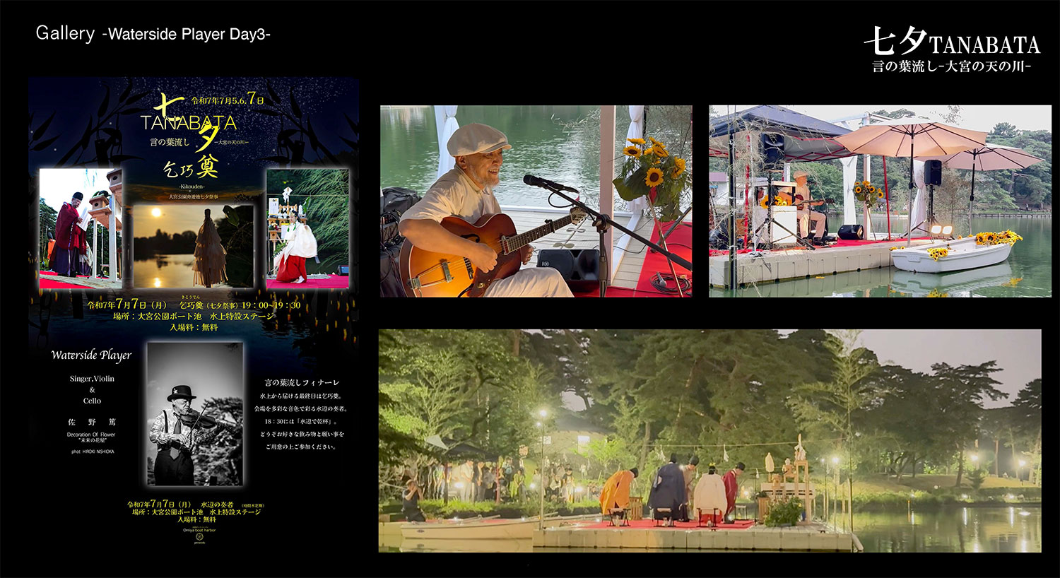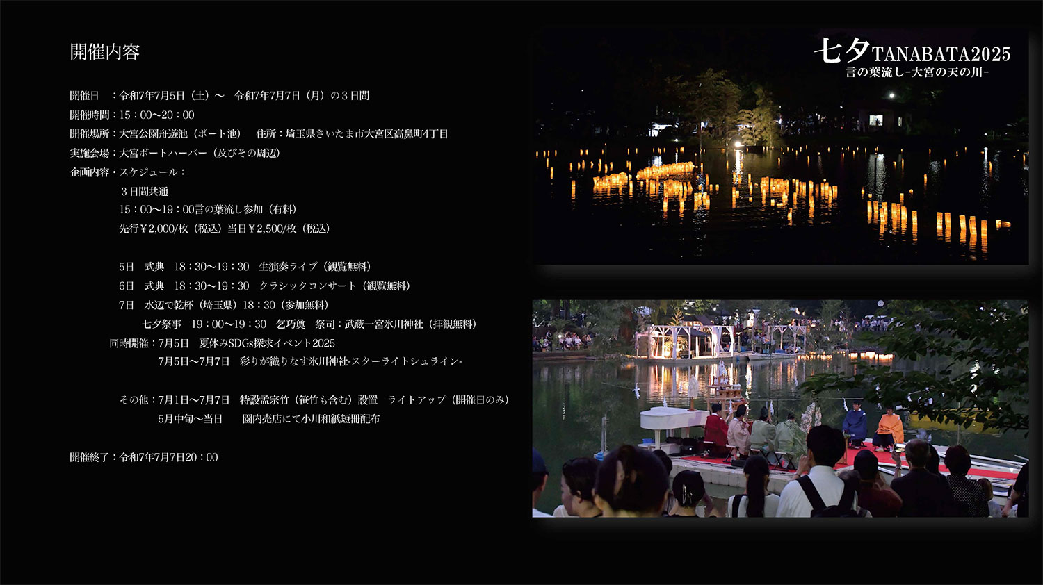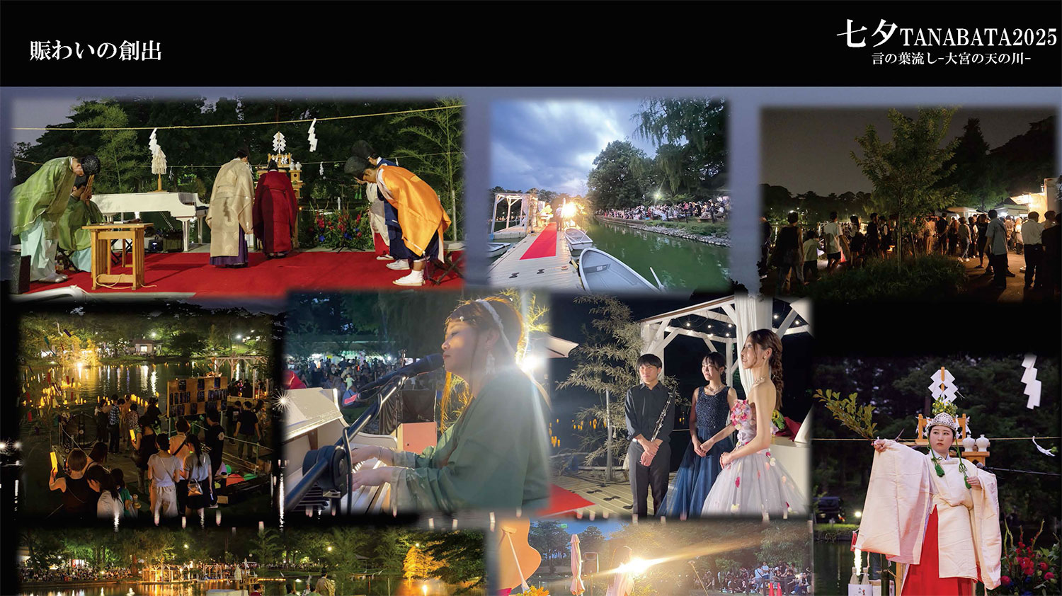 イベント開催日にちなみ、七夕の起源とされる「乞巧奠」の儀式が、舟遊池の水上で執り行われました。水辺の利活用について新たな可能性を見出すことができたほか、七夕という慣れ親しんだ行事の起源を掘り起こし、その真意や存在意義を再確認する機会となりました。