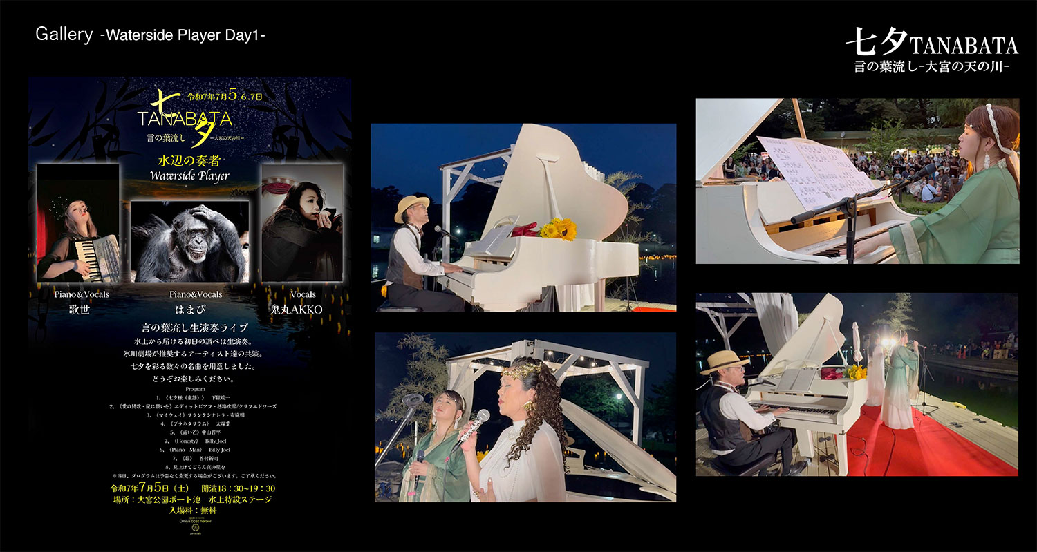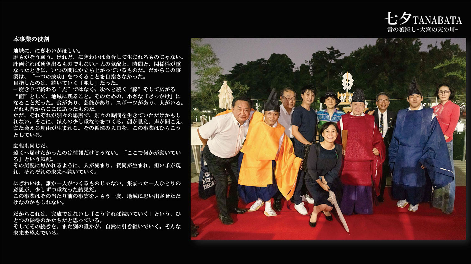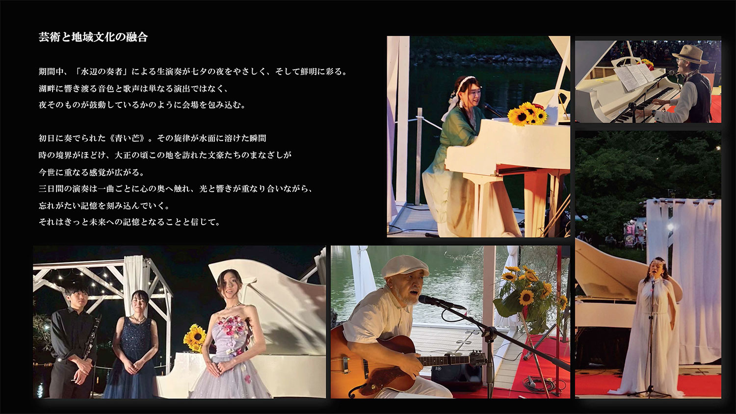 イベント開催日にちなみ、七夕の起源とされる「乞巧奠」の儀式が、舟遊池の水上で執り行われました。水辺の利活用について新たな可能性を見出すことができたほか、七夕という慣れ親しんだ行事の起源を掘り起こし、その真意や存在意義を再確認する機会となりました。