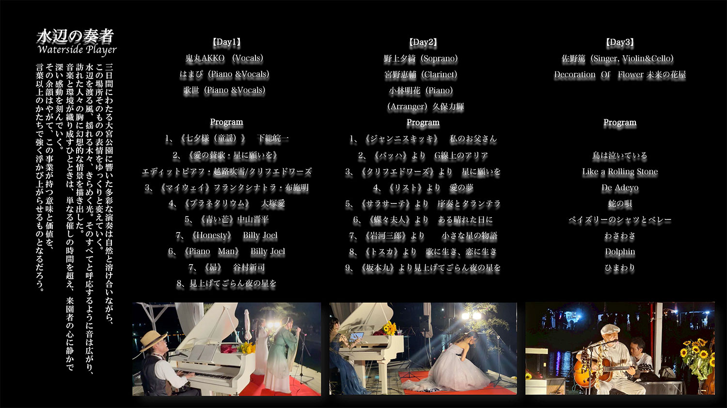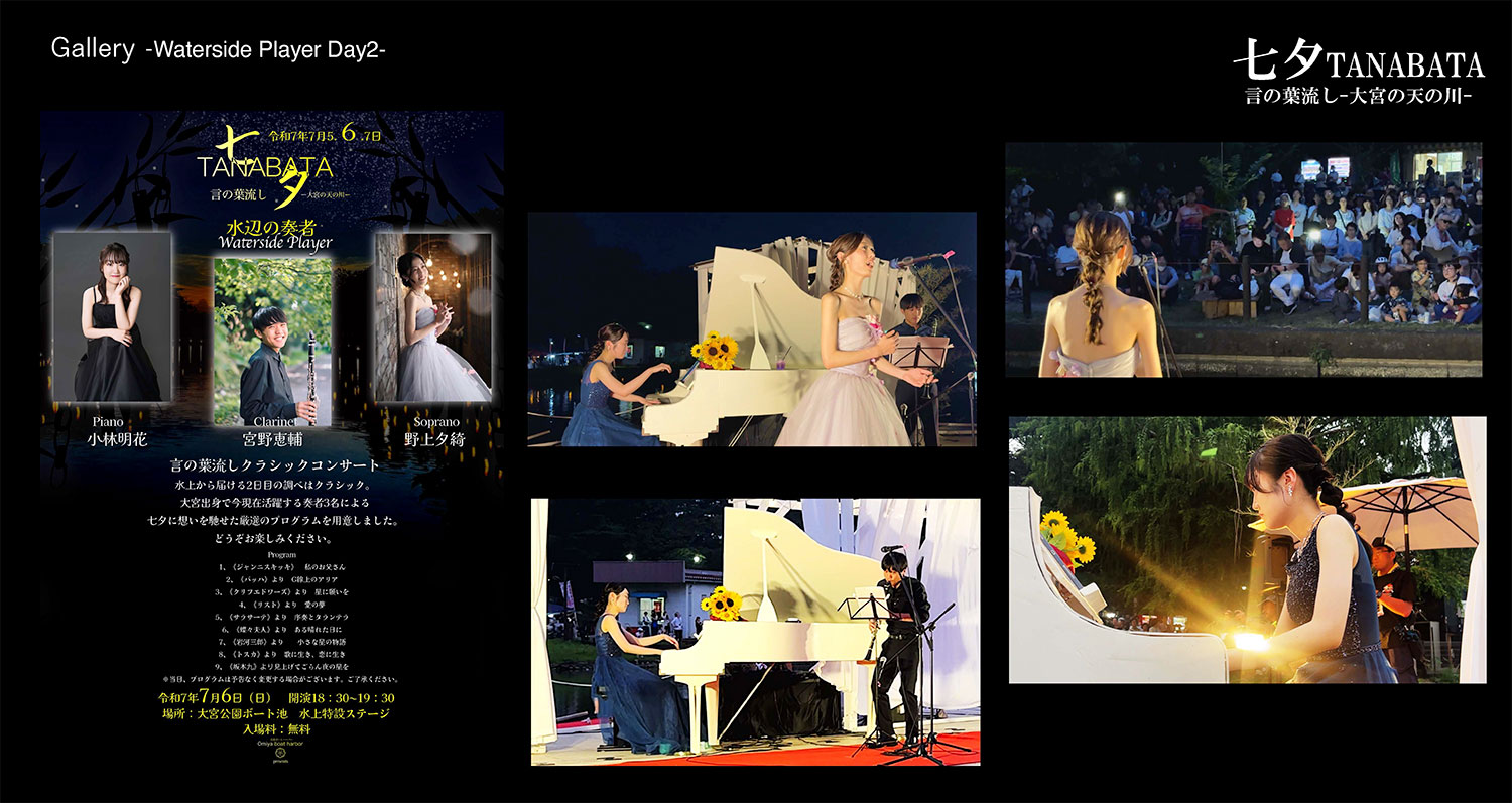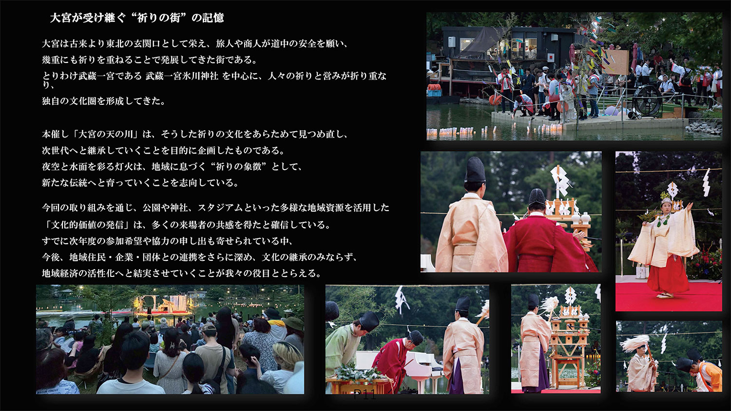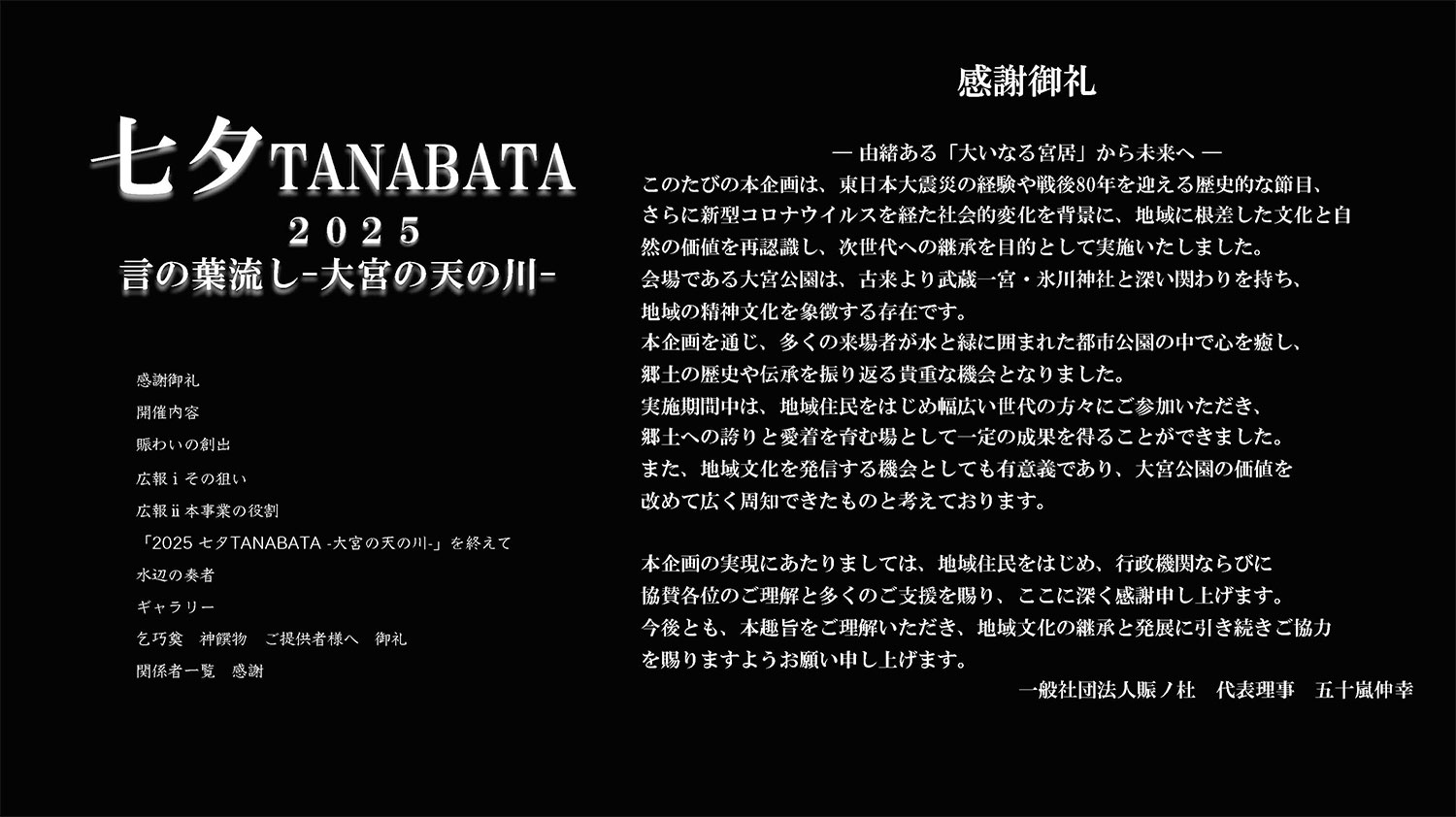 イベント開催日にちなみ、七夕の起源とされる「乞巧奠」の儀式が、舟遊池の水上で執り行われました。水辺の利活用について新たな可能性を見出すことができたほか、七夕という慣れ親しんだ行事の起源を掘り起こし、その真意や存在意義を再確認する機会となりました。