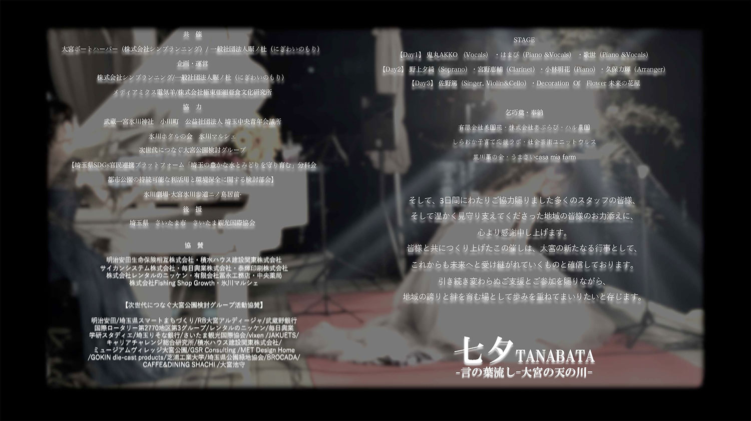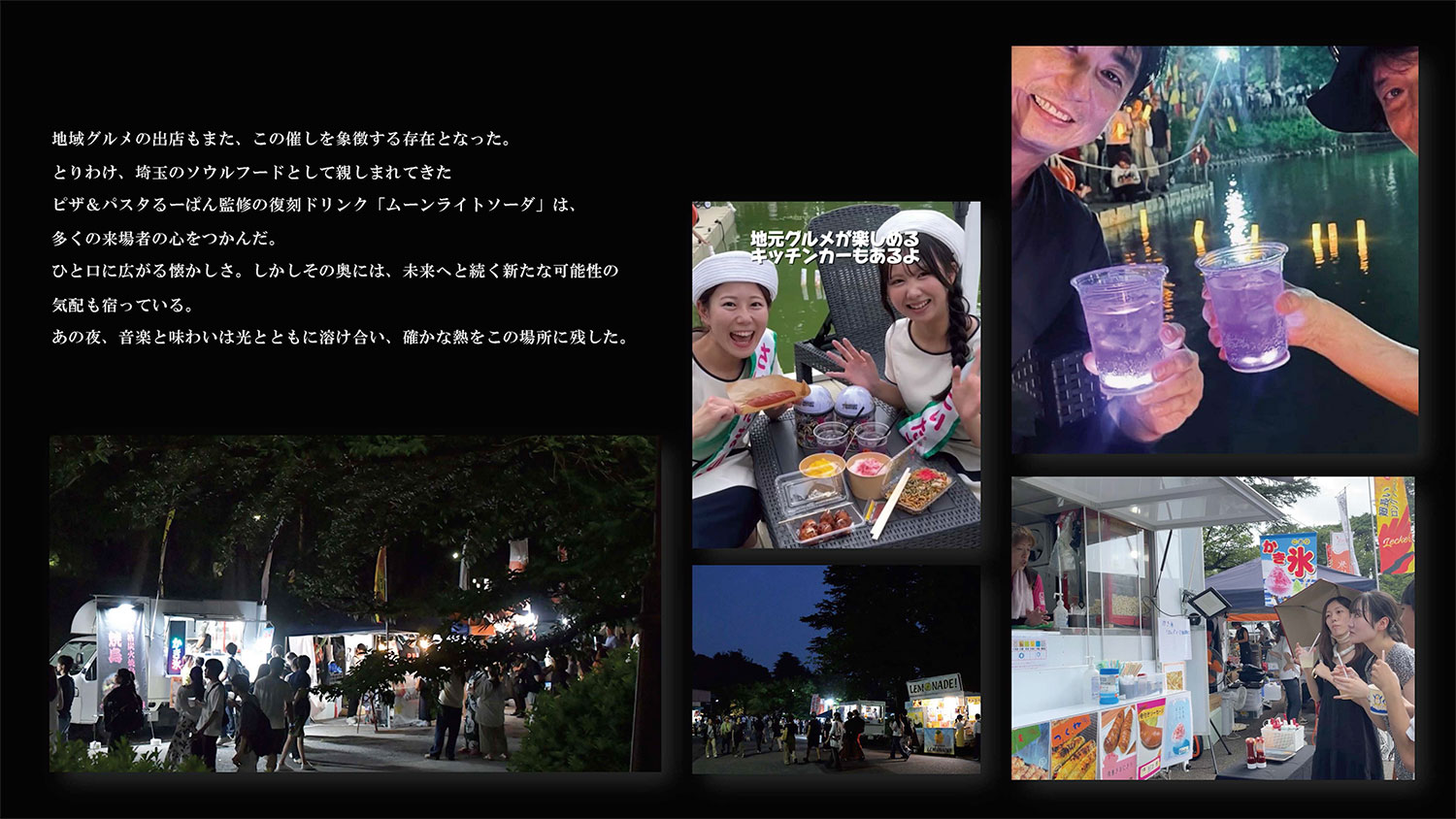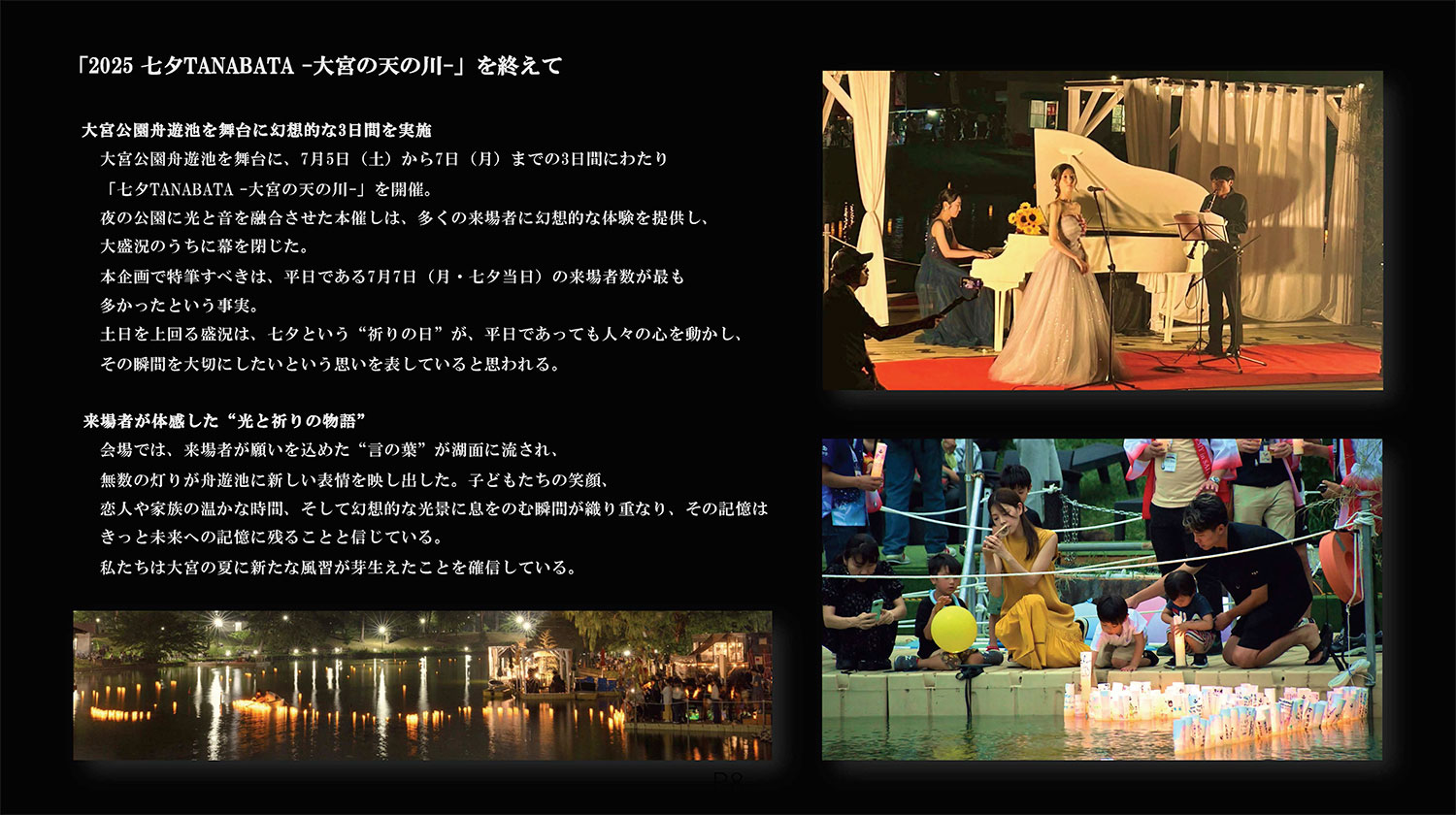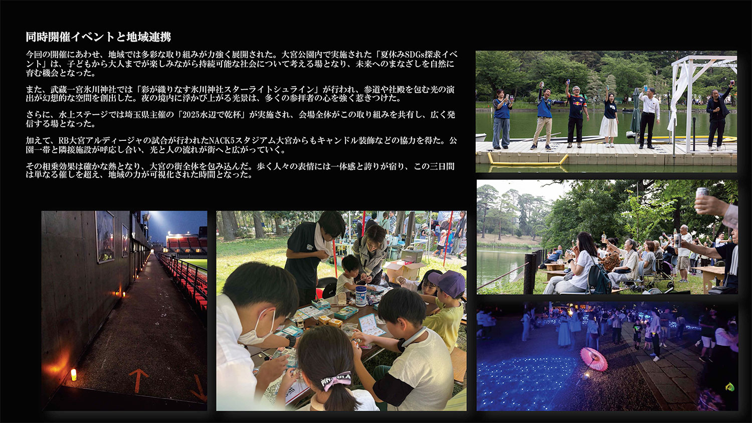 夏の夜空の下SDGsロゴが舟遊池に煌めく様子は、私達が日頃より取り組んでいる水質改善や環境保全活動における未来を表しているかのようで、ご来場くださった方にも再生後の大宮公園像を垣間見て頂けたのではないかと思っております。