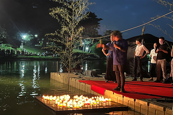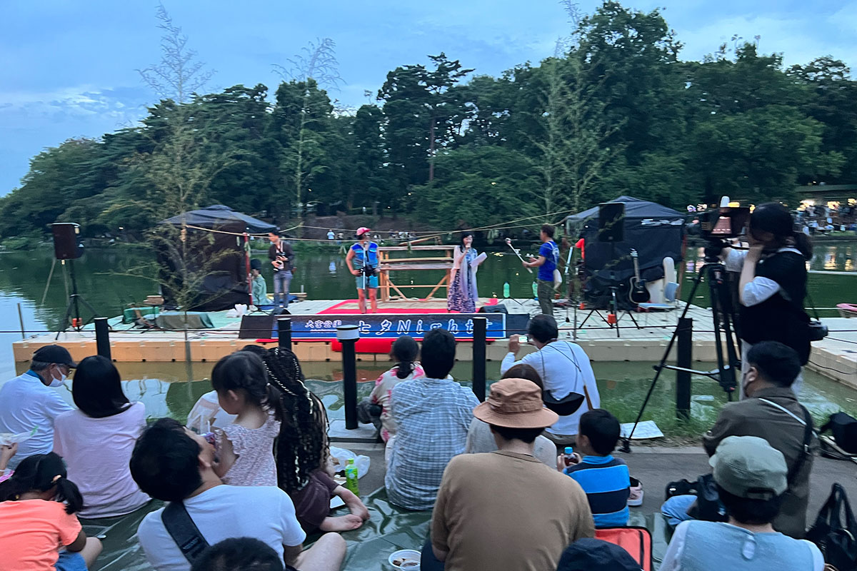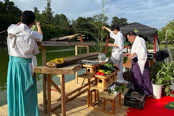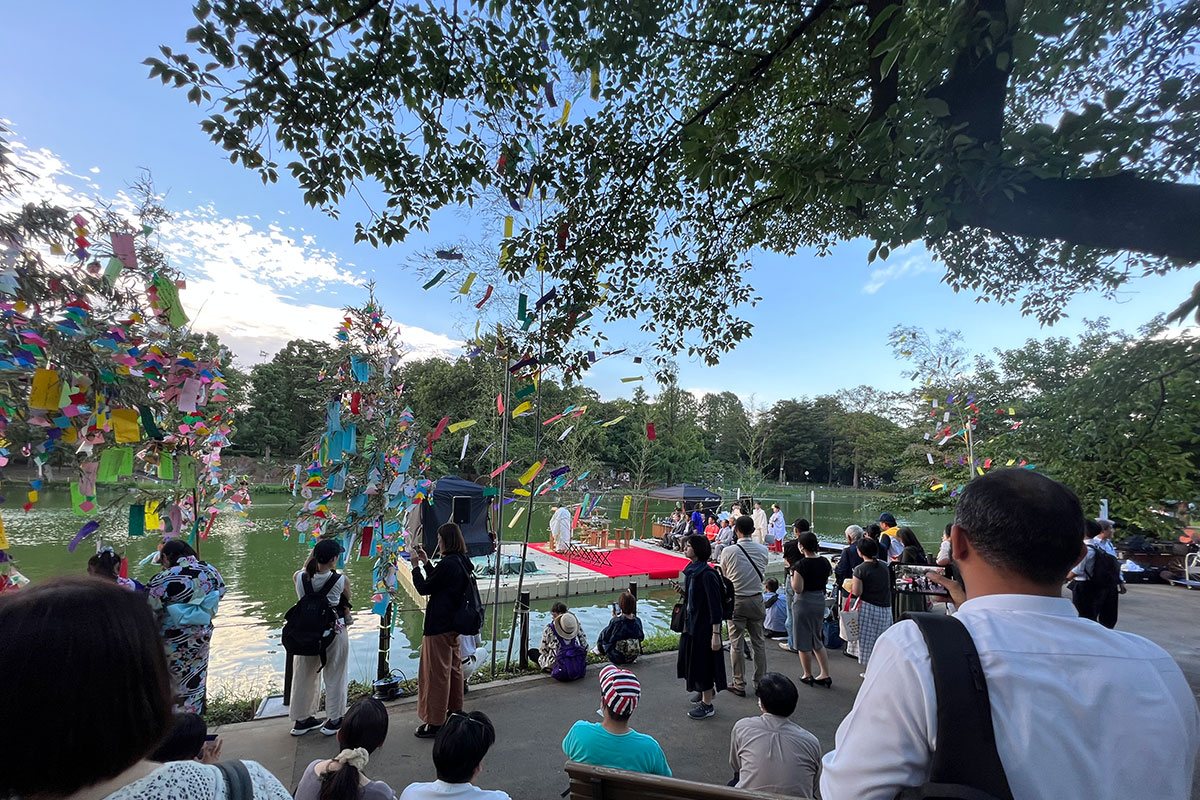 イベント開催日にちなみ、七夕の起源とされる「乞巧奠」の儀式が、舟遊池の水上で執り行われました。水辺の利活用について新たな可能性を見出すことができたほか、七夕という慣れ親しんだ行事の起源を掘り起こし、その真意や存在意義を再確認する機会となりました。